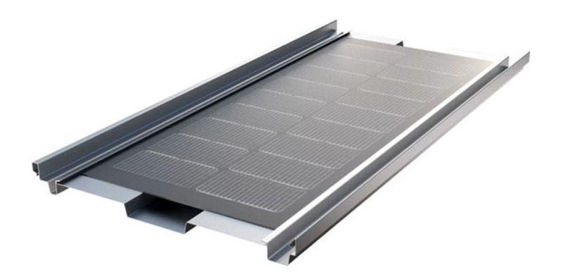 専用の太陽光発電モジュールを屋根材と一体化させたBIPV(建材一体型太陽光発電)モデル。軽量であることも特長で、従来のガラスモジュールを用いたシステムと比較して、重量を半分以下に抑えることができるという。耐荷重の制約により太陽光の設置を断念していた古い建物でも、追加の構造補強を行うことなく導入することができる。