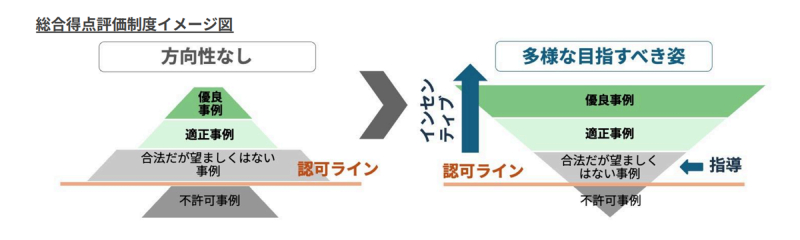 一般社団法人ソーラーシェアリング推進連盟では、不適切な事例を排除しつつ、優良なプロジェクトを育てるための「総合得点評価制度」の導入を提案している。「総合得点評価制度」は、遮光率などの単一の項目で一律に「足切り」をするのではなく、地域共生、エネルギー自給、営農の持続性などを多角的に評価し、優良な取り組みにインセンティブを与える仕組みとするよう要望している。
