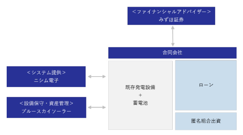 みずほ証券は、ファンド組成、投資家・レンダーの招へいを担当する。九州電力グループのニシム電子工業は、発電所と蓄電池を制御するシステムを提供する。ブルースカイエナジーはEPC事業者として、企画および建設工事を担当した。ブルースカイソーラーは、蓄電池の設置工事時や発電設備の保守管理、ブルースカイアセットマネジメントは、アセットマネジメント業務を担当する。