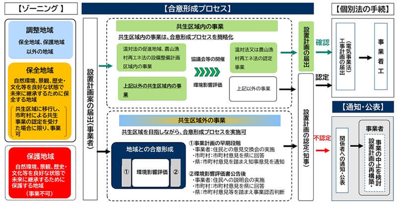 条例はゾーニングと合意形成手続きの2つで構成されている。ゾーニングでは再エネ事業を基本的に実施できない「保護地域」、条件によって事業が可能となる「保全地域」、それ以外の地域を「調整地域」と設定している。そのうえで調整地域および保全地域のうち、市町村の申し出に基づき、地域の自然環境、景観、歴史・文化などと共生できると認めた区域を知事が指定した地域を「共生区域」として指定し、意見交換会や説明会などの合意形成プロセスの一部を省略できるとともに、非課税での事業が可能となる。