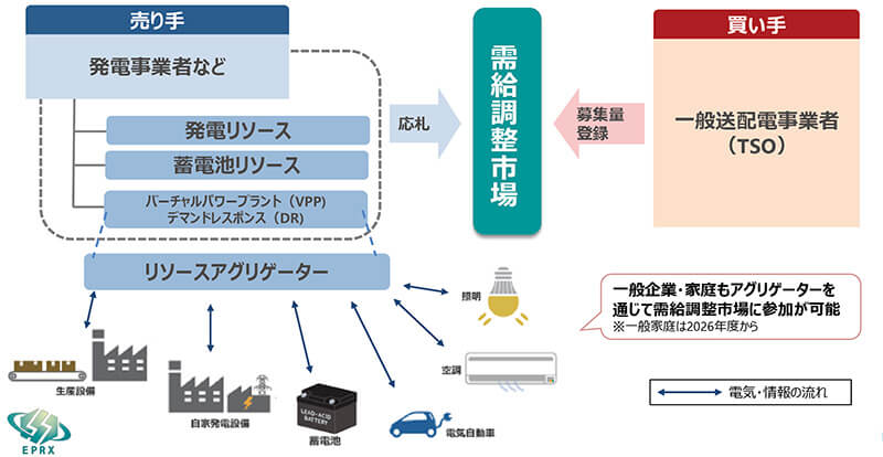 買い手は一般送配電事業者、売り手は発電機などのリソースを保持する発電事業者など。2026年度からは、小規模蓄電池などの低圧リソースを有する一般企業・家庭も、アグリゲーターを通じて市場への参加が可能となる。