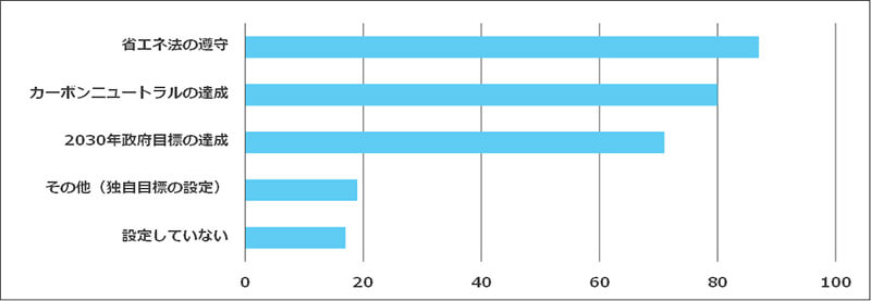 エネルギー管理等指定工場のエネルギー管理担当者274事業所を対象にしたアンケート調査では、何らかの脱炭素目標を設定している事業所は全体の9割以上にのぼる。設定目標は、「省エネ法の遵守」、「カーボンニュートラルの達成」、「2030年政府目標(13年度比46%削減)の達成」が上位を占めた。一般機械器具、非鉄金属などの業種ではCN達成を目標にする事業所が多く、食料品では省エネ法遵守にとどまる傾向がみられた。