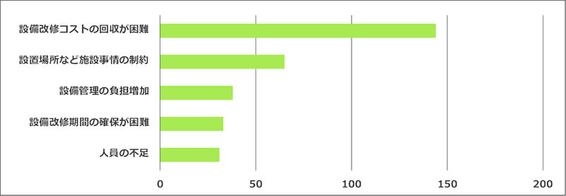 CO2排出量削減における課題としては、「設備改修コストの回収が困難」が最も多く、次いで「設置場所など施設事情の制約」、「設備管理の負担増加」などが挙げられた。