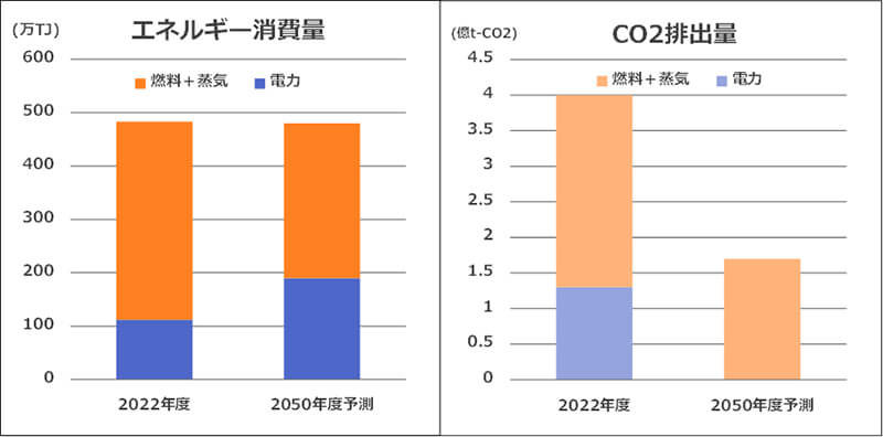 脱炭素化の実現に向けて、製造業のエネルギー消費量に占める電力の割合は2050年度には39.7%に増加する見通しだ。しかし、設備改修コストや施設事情の制約などの理由から50年度のCO2排出量は、22年度の4割程度と予想されている。