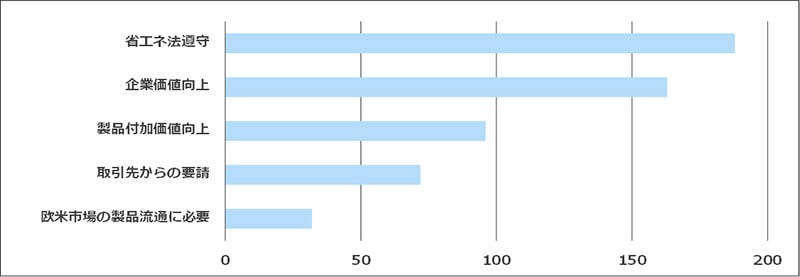 CO2排出量削減の動機・背景は、「省エネ法遵守」が最も多く、次いで「企業価値向上」となっている。「企業価値向上」は、化学(医薬品)、非鉄金属、電子部品などの業種で回答が多かった。3番目に多い動機は「製品付加価値向上」で、自動車関連の取引先からの要請があるゴム製品などで特に高くなっている。