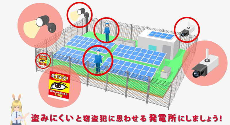 盗難被害を防ぐには、事業者・行政・地域が一体となって対策を講じる必要がある。日本損害保険協会関東支部委員会は、関東地方で太陽光発電施設の金属ケーブル盗難が多発している状況を踏まえ、茨城・千葉・群馬・栃木の4県の県警と連携して注意喚起動画を制作した。動画では、センサーライトや警報器、AIカメラ、フェンス、ワイヤーセンサーといった複数の防犯手段を組み合わせた多重防犯の重要性を紹介し、事業者に対策強化を呼びかけている。こうした官民連携による啓発活動は、発電事業者側のリスク認識を高め、地域全体で盗難抑止の体制を整える動きにもつながっている。