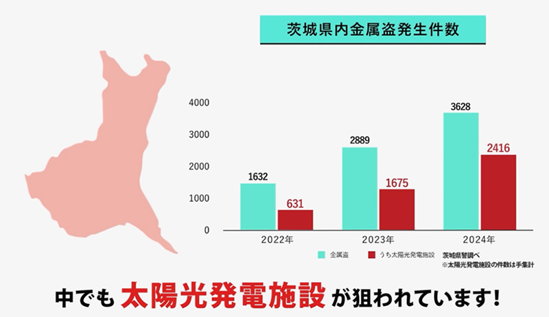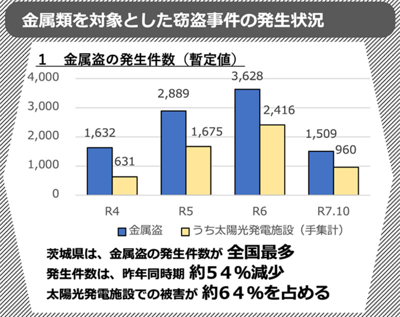 法律や条例の施行と警察の取り締まり強化によって、金属ケーブルの盗難被害は減少しつつある。茨城県は金属盗難の件数が20年から5年連続で全国最多となっている。茨城県警のまとめでは、25年1月から10月までの金属盗認知件数は1509件(このうち太陽光発電施設は960件)と前年同期比で54%減少している。千葉県でも、金属盗認知件数が昨年に比べて減少傾向にあるという。